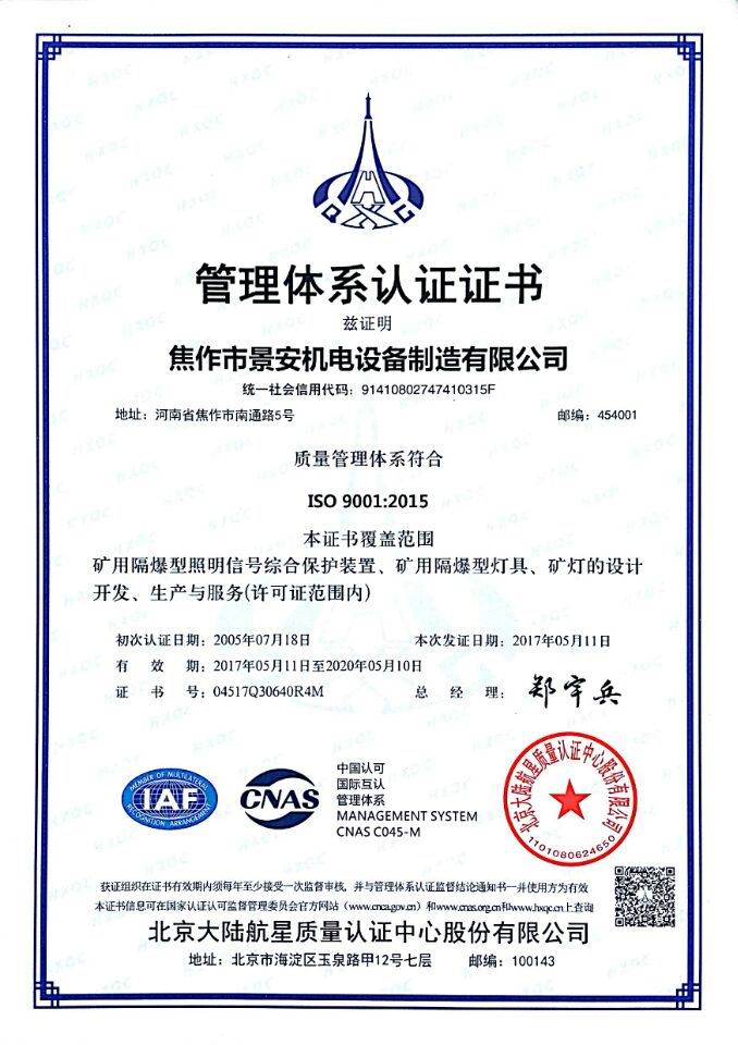 焦作景安公司始終堅持“以科技為先導,以市場為導向”的發展戰略,不斷進行新產品的研制和開發,在國家“六五”到“九五”期間,承擔和參與了國家多項科技攻關項目。并被中國電器工業協會評定為“質量可信產品”。特別是在礦用防爆燈領域,礦用隔爆型半導體(LED)照明燈具,2008年列入國家火炬計劃,獲2009年河南省工業和信息化廳的科技成果二等獎,并擁有多項國家專利。
